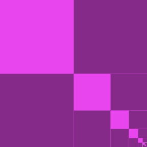 | 1) The first in my series of problems is the picture on the Right. Assuming that this square has been quartered infinitely, and the top left quarter of each of THOSE quarters is filled in, what fraction of the square winds up, as the light-purplish color, in the end? (college geometry, 1994, Musser and Trimpe, Prentice-Hall Inc) |